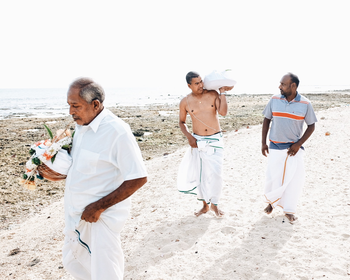 my uncles walking along the keerimalai beach before throwing the ashes into the indian ocean. The ashes are in the brown pot with the flower garland.