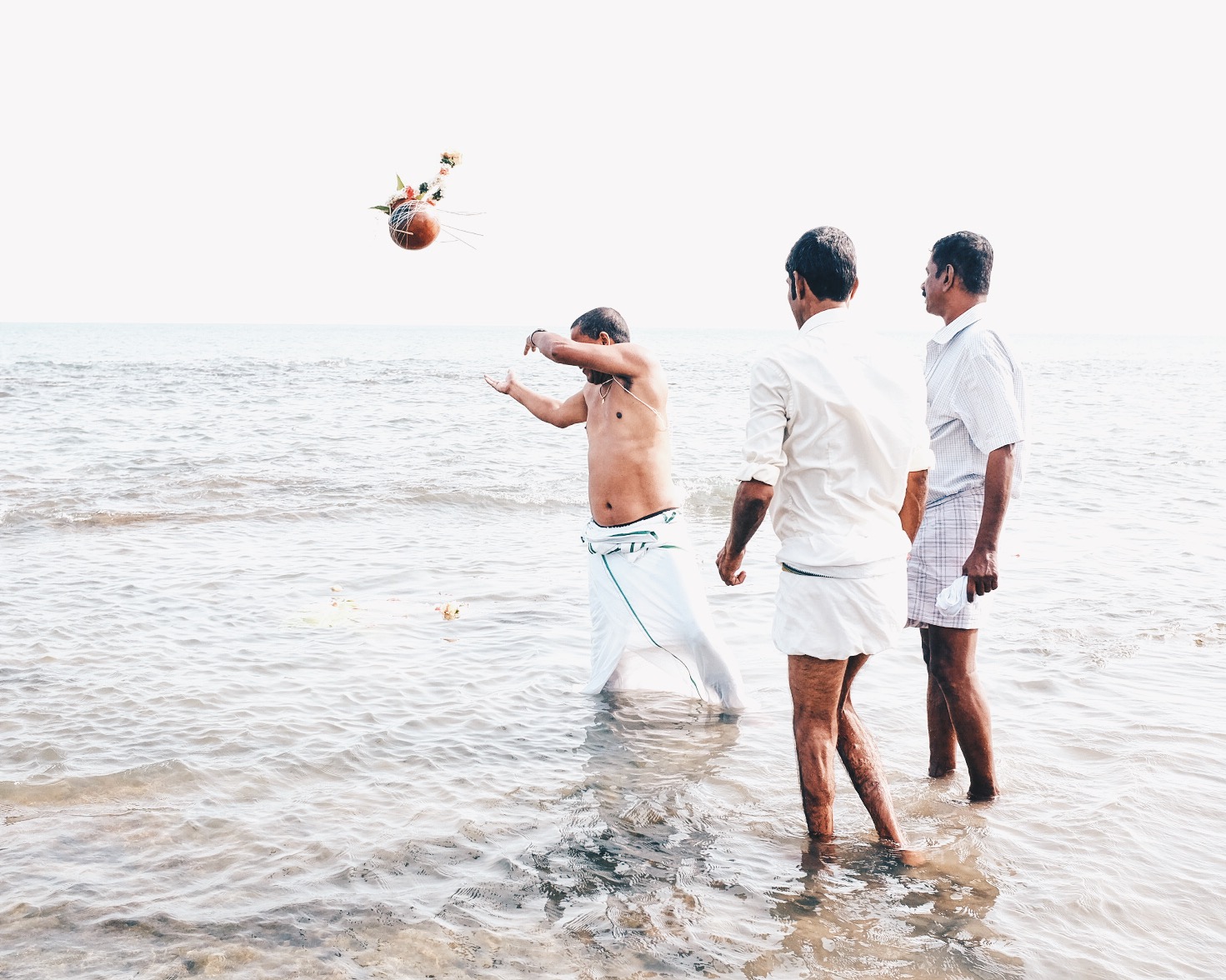 my uncle throwing the pot with my grandmothers ashes into the indian ocean. There was also a little boy who had to do this ritual, so probably one of his parents died also a month ago.