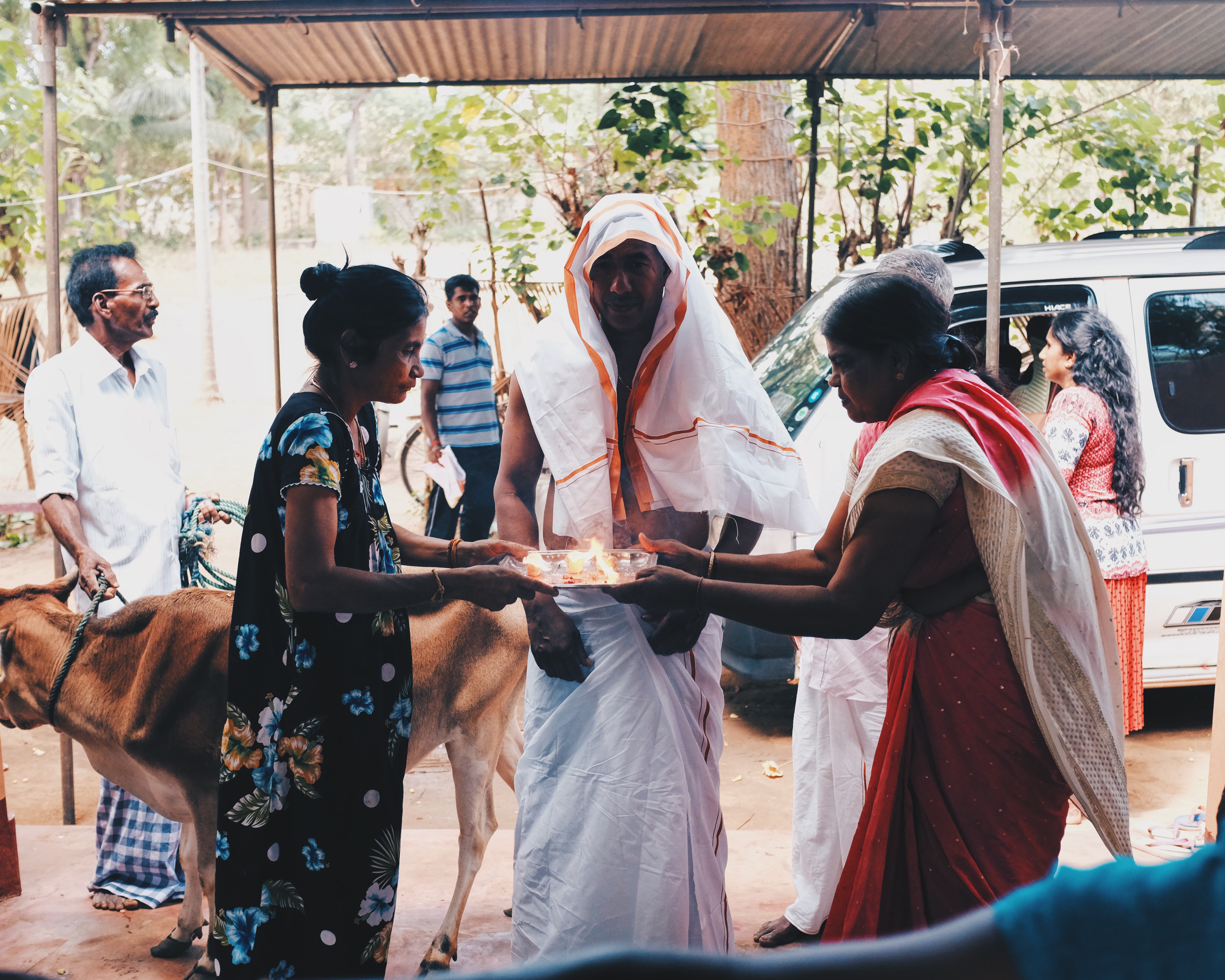Welcoming back my uncle after arriving from Keerimalai. A cow was also always present until the last day in our frontyard. Historically, a cow is offered to the Brahmin priest, but nowadays its just a symbolic gesture and you give the Brahmin money. But I read that the cow is also seen as an assistant for the deceased. It will help their souls to find the right path to liberation.